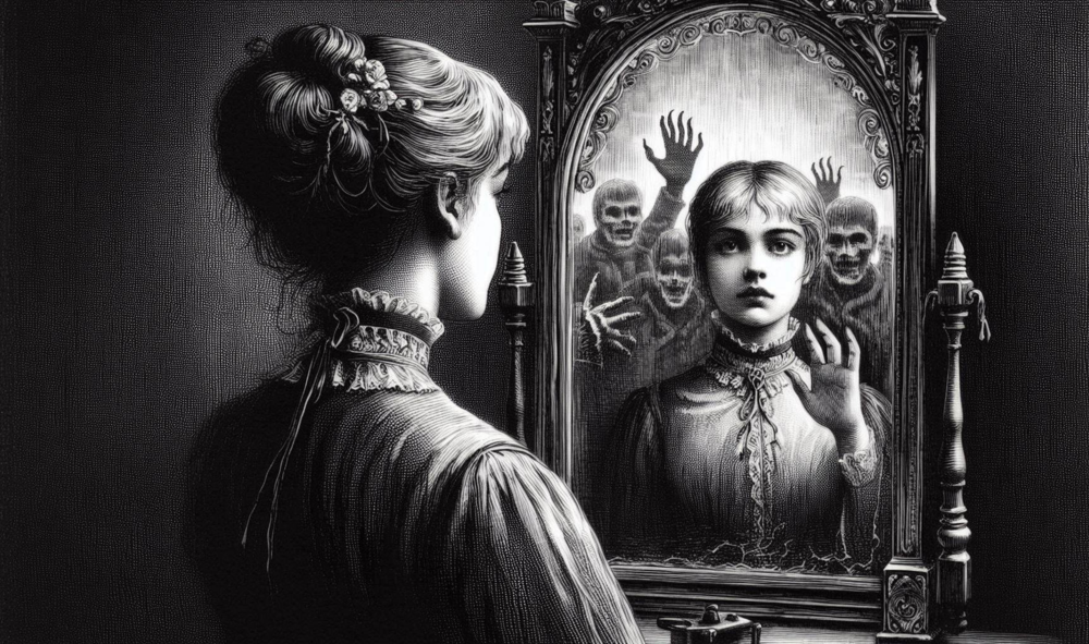 Amanda's reflection wavered again, and this time she was certain she glimpsed something - or someone - else. A figure in old-fashioned clothes, their face a blur of terror. The image lasted only a second before dissolving into ripples across the glass. Amanda stumbled back, her heart racing. She told herself it was a trick of the light, her imagination running wild in this old house full of history and shadows.